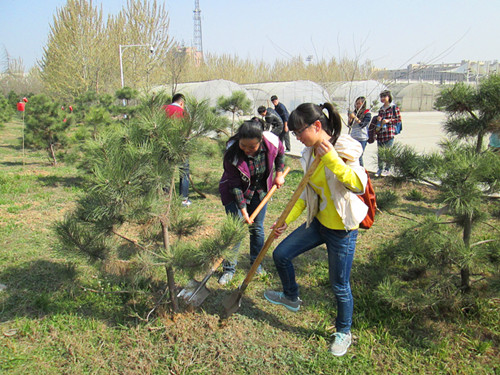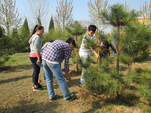 活动在博览园工作人员的安排协调下于2点开始,首先,工作人员将同学们需要做的铲草松土任务做了安排,并亲自示范怎样才能有效的帮助树木更好地生长且不伤害其根系。参与活动同学热情高涨,纷纷拿起铲子,两三个人一组,逐一对园内及园区停车场的松树进行铲草、松土等作业。活动在早春炙热的阳光中持续了一个下午。