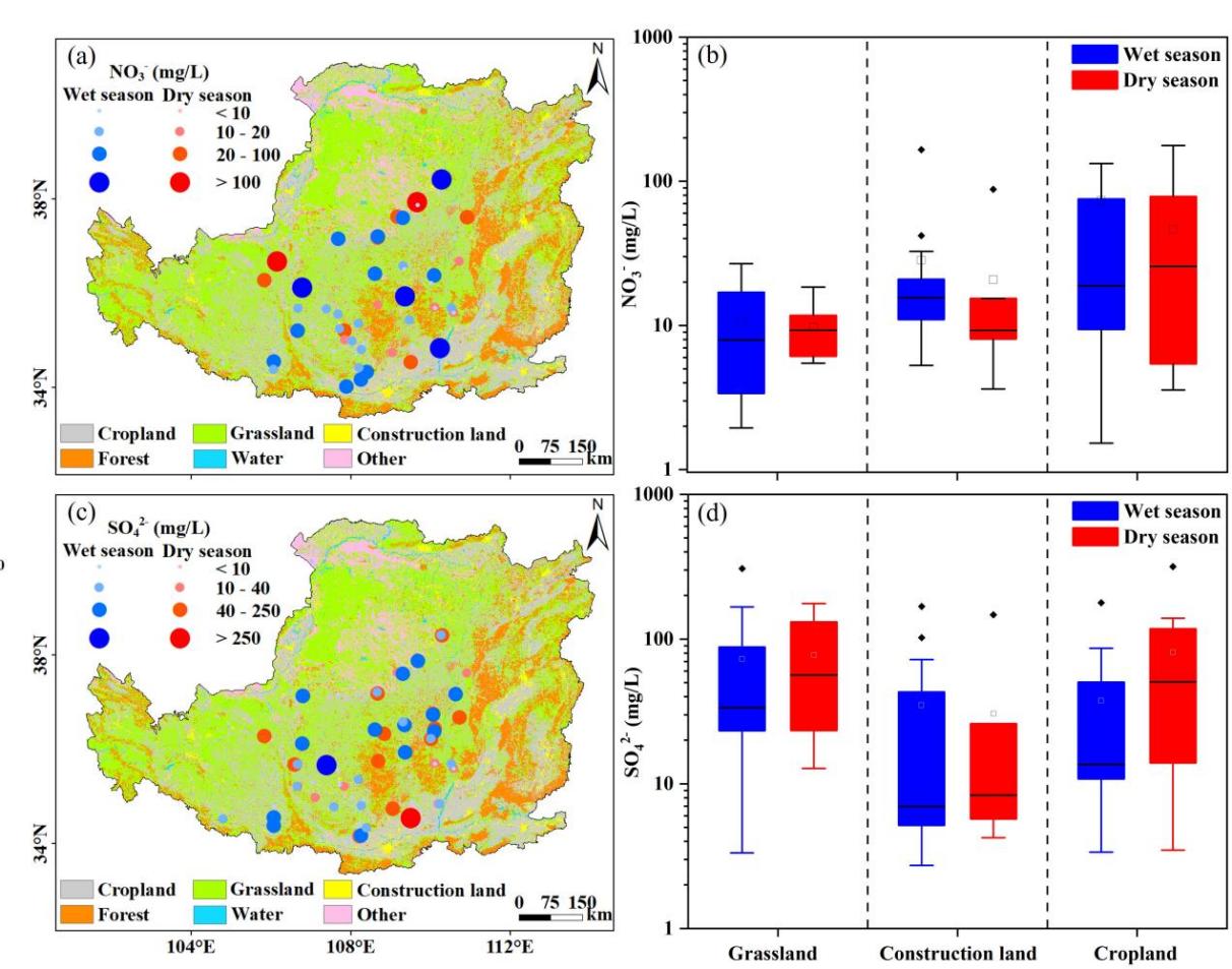 图1 黄土高原浅层地下水NO3-和SO42-浓度时空分布及不同土地利用类型浓度箱型图