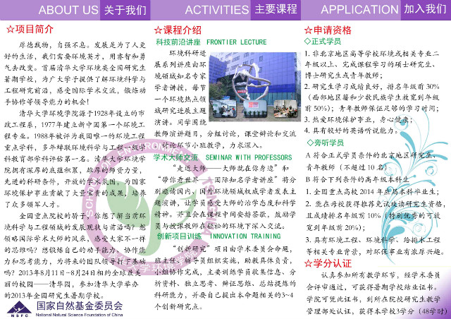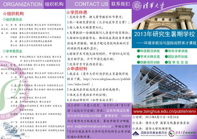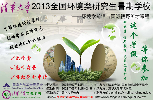 由清华大学和国家自然科学基金委主办,清华环境学院承办的2013将于2013年8月11日~8月24日在清华园举行,现已开始火热报名,欢迎有意向参加的青年教师和员工关注宣传海报和网站通知(http://www.tsinghua.edu.cn/publish/env/6362/index.html),积极报名。