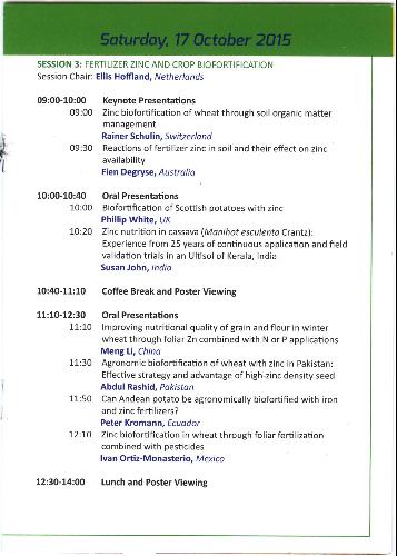 《国际锌研讨会》由国际锌协、国际肥料工业协会和HarvestPlus联合举办,每3年举办一次,地点不定。此次会议参会人员为包括世界从事锌相关研究的科研人员及企业家在内的近200人。鉴于锌在作物生产和人体营养方面发挥的重要作用,该会议旨在探讨国际锌研究最新动态,寻找应对锌缺乏的最佳农艺措施并关注其对全球作物生产和人体健康的影响。包含人体营养和社会环境影响;植物生理学、遗传学和分子生物学;肥料锌及作物生物强化以及土壤和环境中的锌4个议题。