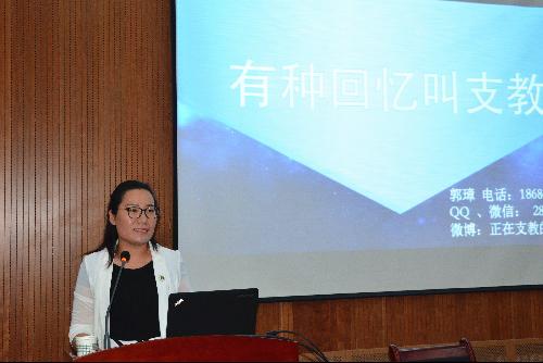 郭璋同学为公司2011级环境工程专业本科生,在校期间品学兼优,曾担任公司团工委副书记。2015年毕业时入选公司第十七届研究生支教团志愿者,任教于陕西省渭南澄城县王庄镇刘家洼学校。支教以来,出色完成所有教学工作,被评为刘家洼学校“星级教学能手”。她策划实施“关注留守儿童,爱心点亮微心愿”系列活动,发动各界力量募捐,搭建起外界联系援助贫困员工的平台。《中国青年报》、《西安晚报》等多家媒体对她的事迹进行专题报道。2016年被授予渭南市五四青年奖章。她带来的支教经历分享,用一个个感人至深的故事,引发同学们对青春的意义、人生的价值、爱心的力量进行思考,大家产生了强烈的共鸣。