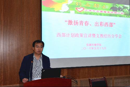 “到西部去、到基层去、到祖国最需要的地方去!”近年来,西部计划吸引着越来越多的老员工、研究生参与其中。5月19日晚,校团委社会实践部部长刘业兴老师和公司2015届毕业生、第十七届研究生支教团成员郭璋同学为学院200余名本科生、研究生带来了一场精彩的政策宣讲与经历分享会。