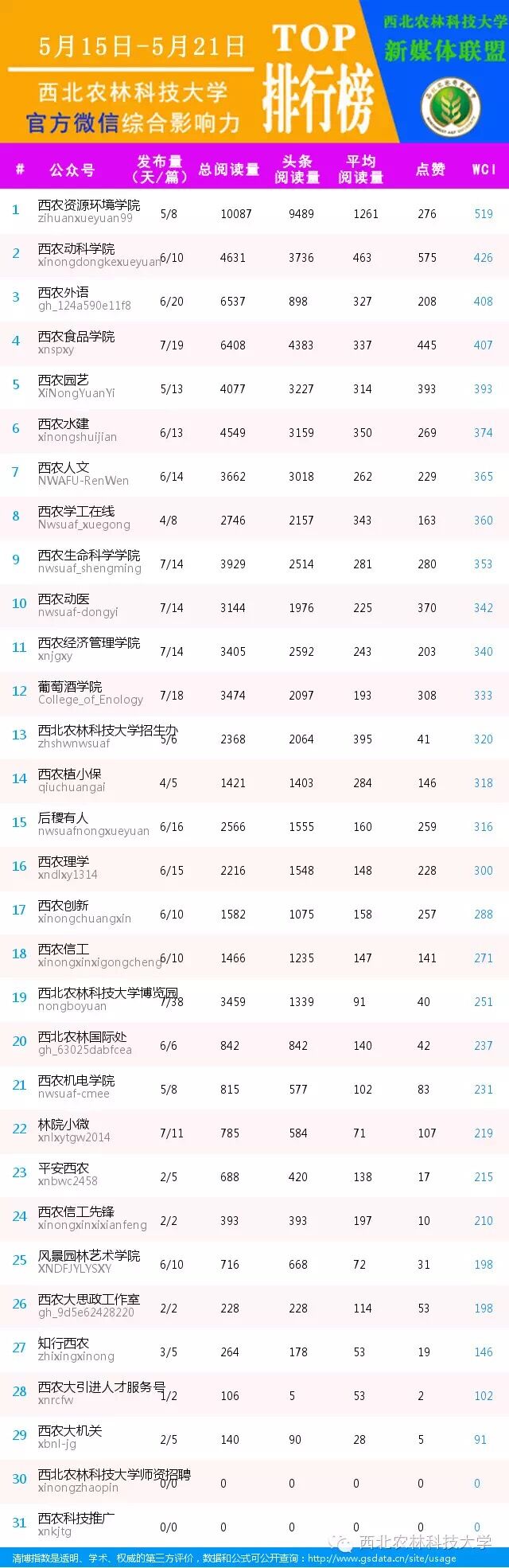 在上一周(5月15日-21日)的yl7703永利官方微信综合影响力排行榜中,公司官方微信平台WCI指数以绝对优势位列第一(1/31)。微信运营团队的编辑们以一篇关于“班级风采大赛”的推送获得8300多阅读量和近200的点赞数,为排名跃居榜首奠定了坚实基础。