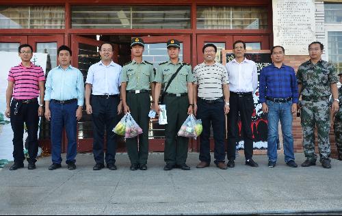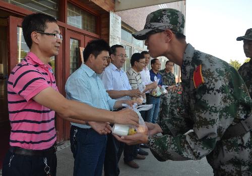 随后,公司党委副书记田长河、副经理王旭东、李志、王云峰,经理助理张青峰为教官和新生们分发慰问品,第一个领到慰问品的李彦欣同学表示,“虽然连日的阴雨让军训显得有些困难,但学院的关怀就像今天的阳光一样,温暖着我们每个人,我们一定全力训练,争取在军训汇演中取得好成绩,我们有信心当好一名心有理想,感恩前行的资环人!”