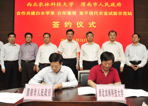 渭南市政府、市农业局、市发改委、市财政局、白水县、合阳县、富平县主要领导和公司党委董事长办公室、推广处、园艺学院、 葡萄酒学院、资源与环境学院负责人以及三个试验示范站首席专家出席了校市合作共建签字仪式。