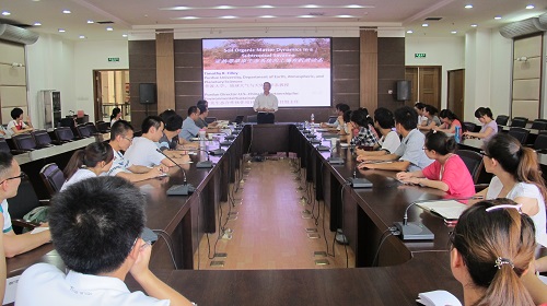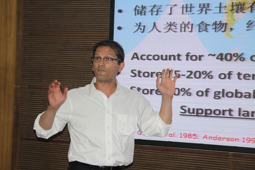 报告会上,Timothy R. Filley教授以草原在生态系统中的重要作用为切入点,强调了草原灌丛化对生态环境的影响,着重介绍了影响有机质稳定性的因素,并详细介绍了其研究方法––物理筛分法的各项指标及研究结果。Timothy R. Filley教授还通过13C同位素标记的方法,对C3、C4植物中有机质稳定性的区别进行了深入研究。他的报告使听众更好地了解了草原生态系统灌丛化过程中与土壤有机质富集之间的关联,对农业生产、生态环境建设具有一定指导意义。