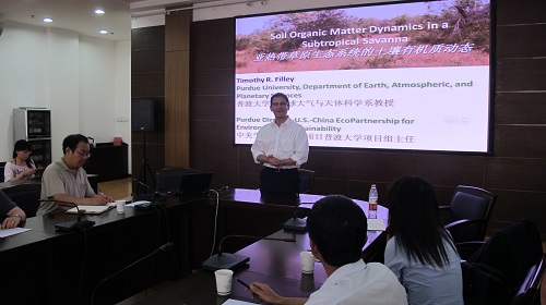 Timothy R. Filley教授,1967年11月10生,1990年获芝加哥洛约拉大学学士学位,1997年获宾夕法尼亚州立大学博士学位,1997 —2000在华盛顿卡内基研究所从事博士后研究,2000至今在普渡大学地球、大气和行星科学系工作,任普渡大学中美生态环境可持续发展合作伙伴项目(USCEES)主任。Filley教授长期从事自然和人工生态系统土壤,凋落物以及流域的C,N循环方面的研究,尤其在利用稳定性同位素示踪和环境有机化学结合方法对生态系统C,N循环方面的研究取得了卓越的成绩,在PNAS、Biogeosciences等期刊上发表学术论文30余篇。
