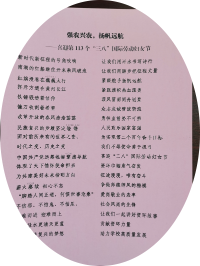 公司党委书记闫德忠、经理田霄鸿,为全院女教工送上节日祝福,并参加诗歌朗诵《强农兴农,扬帆远航》-喜迎第113个“三八”国际劳动妇女节。大家声情并茂,热情洋溢,放声讴歌。没有排练,没有预演,整齐嘹亮,“新时代新征程的号角吹响......”诗歌朗诵鼓舞了大家的工作干劲。