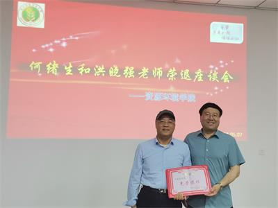 公司党委书记闫德忠代表学院为何绪生和洪晓强两位老师颁发了光荣退休荣誉证书,学院向两位老师赠送了纪念品。