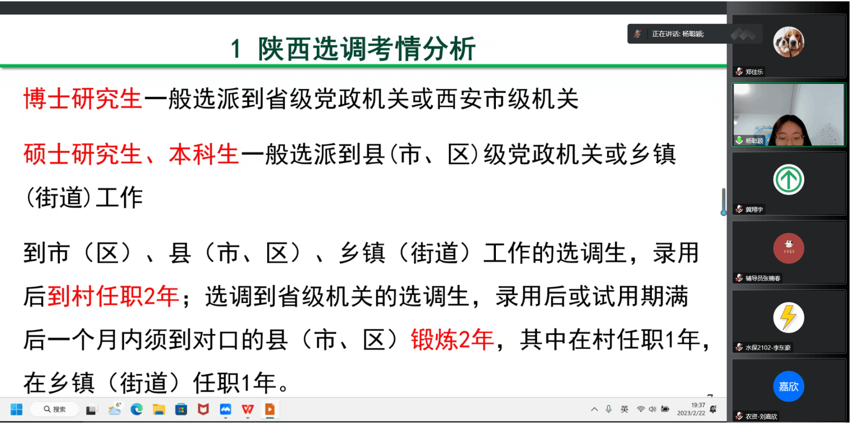 杨聪颖以“经风雨、见世面、壮筋骨、长才干”为主题,从陕西选调生考情分析和自身驻村工作的心得两方面做分享。她首先对陕西选调生的选调条件、工作要求、参选流程等基本政策做详细的解读,着重强调笔试的备考经验和面试的礼仪技巧,并以自己的面试题目为例向大家讲解分析问题的思路与方法。